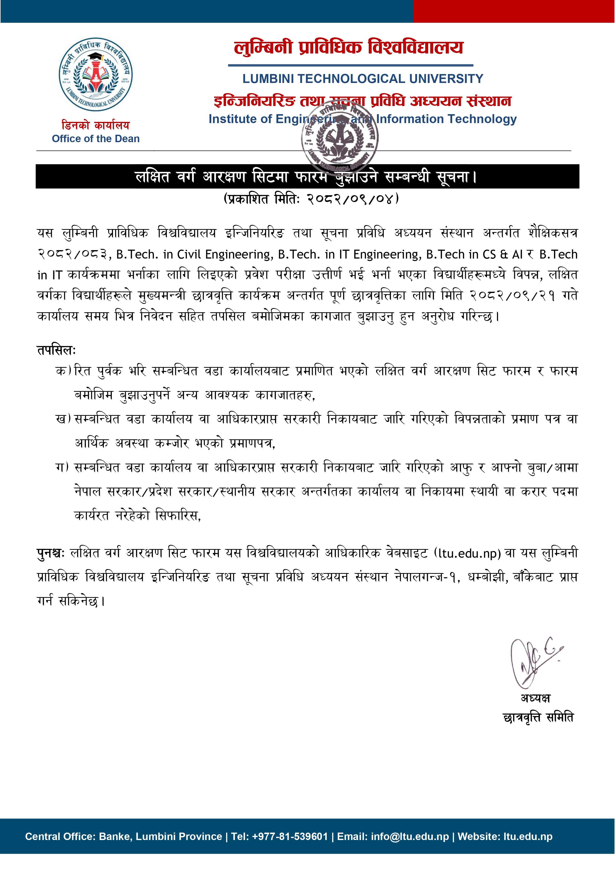 लक्षित वर्ग आरक्षण सिटमा फारम बुझाउने सम्बन्धी सूचना।